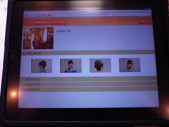 写真を登録することが出来るので、前回のお色や髪の長さなどを 確認出来たりします。 ![]() このシステムが凄いところは、デジカメで写真を撮ると、その場ですぐにiPadで写真の確認が出来ることです。 その間、パソコンにつないだり、SDカードを抜き差ししたりする必要は一切ありません。 着物や浴衣の着付けなどにも利用できます。 カルテ、ヘアカタログ、シャンプーなどの電子カタログなどに使っています。 もちろん、普通にiPadとしても利用できるので、パーマやカラーの間にネットサーフをしたり、 ゲームをして遊ぶこともできます。 #技術的なことにつきましては株式会社ライブログまでお問い合わせください。 株式会社ライブログ http://www.liblog.co.jp/index.php 048-462-6959 担当:元木 BLOG::スタッフから |